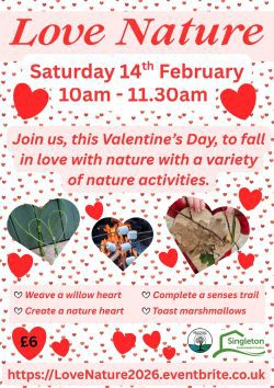 Fall in love with nature, this Valentine’s Day, with our nature activities. You’ll make a willow heart, decorate a cardboard heart with natural materials, complete a senses trail, make a nature pledge and toast marshmallows at the firepit.